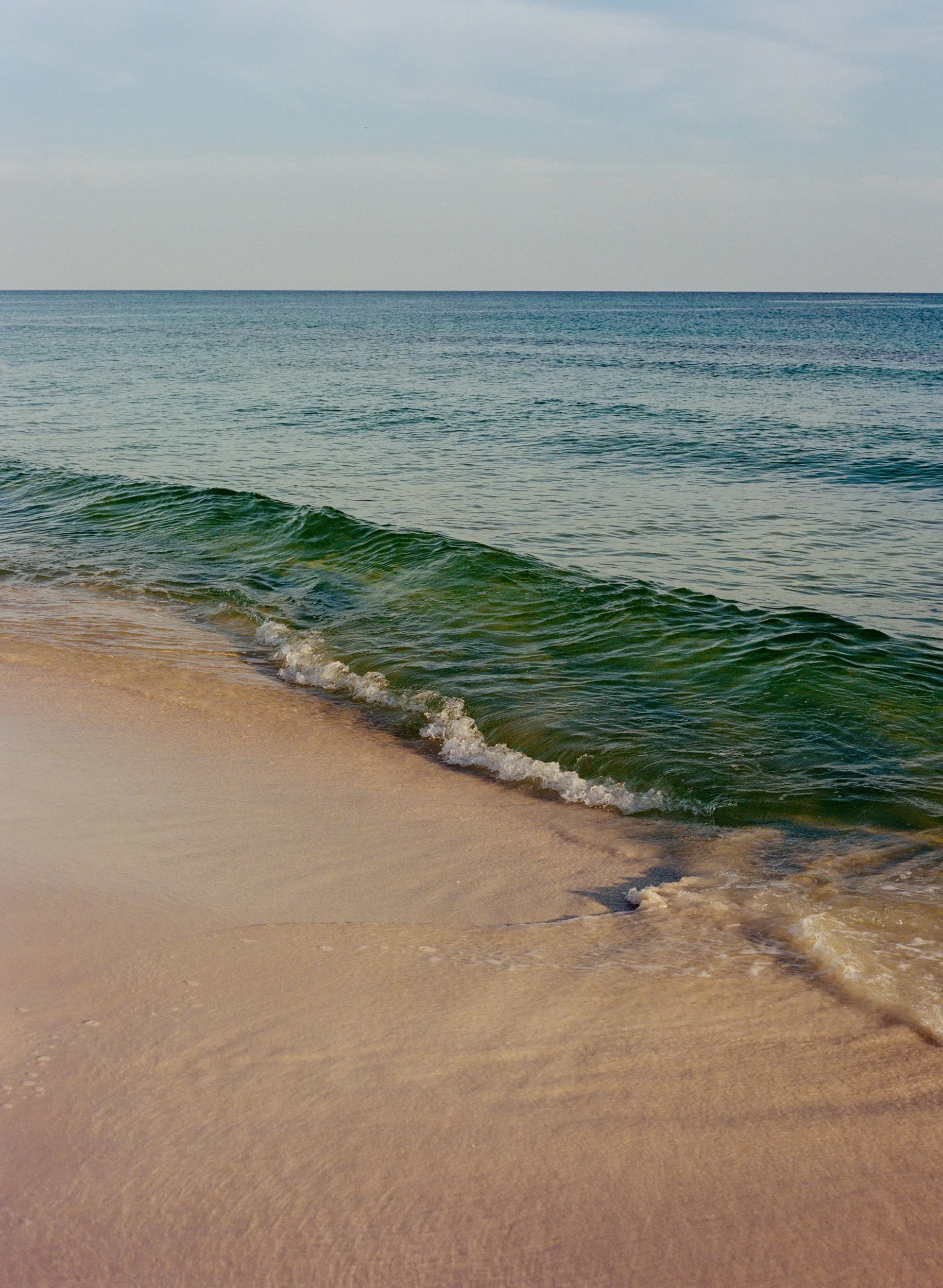 A woman on the beach along the iconic 30A in Florida photographed on medium format film.