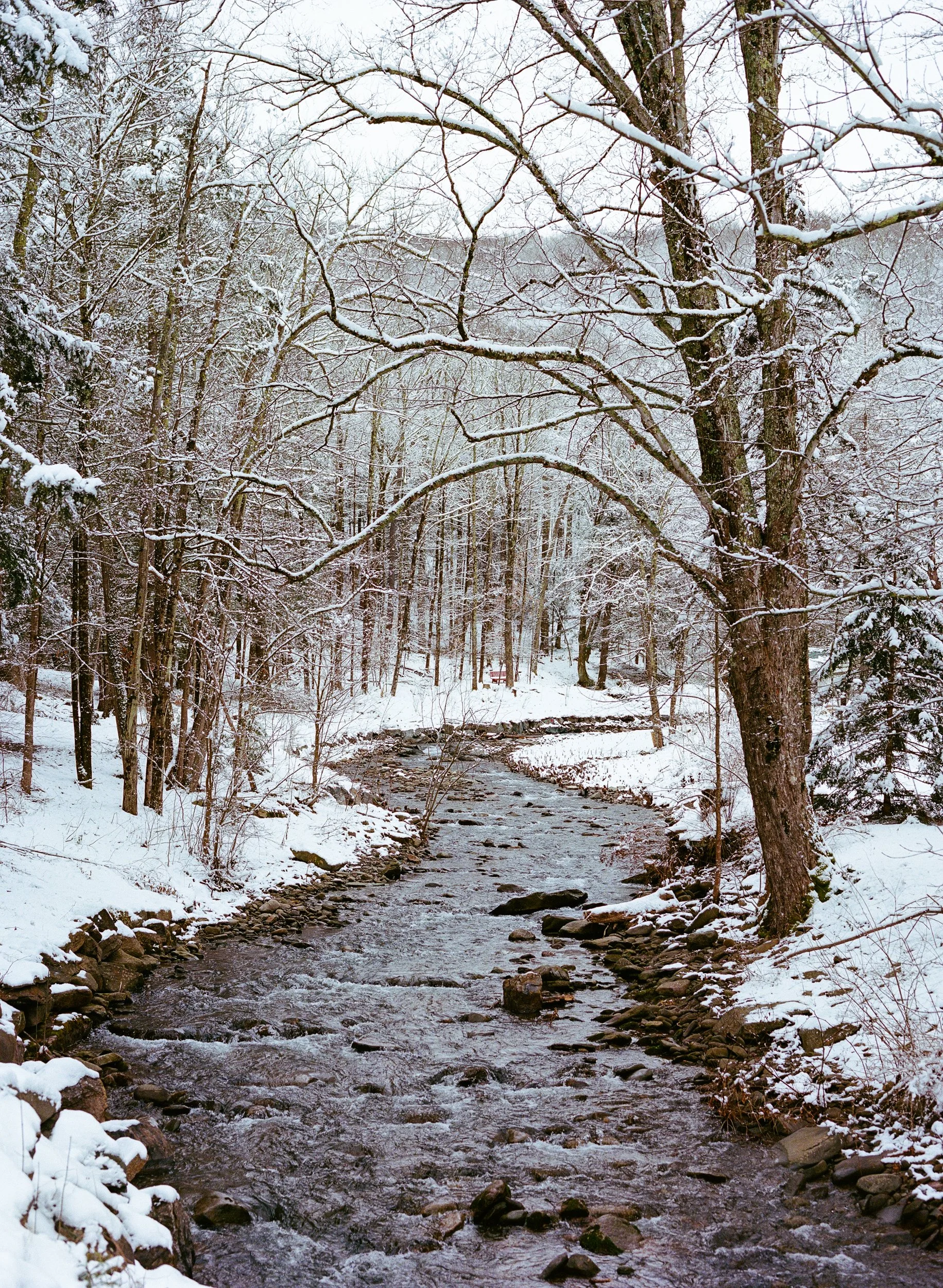 A road in the snow of Upstate New York on a winter morning, photographed on medium format film.